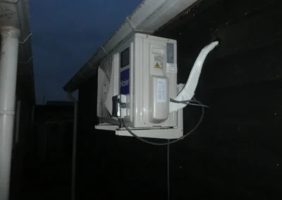 De buitenunit is vakkundig aan de muur bevestigd. Dit zorgt voor een nette afwerking, een stabiele montage en minimale ruimte-inname rondom de tuinkamer. Het resultaat is een comfortabele, goed gekoelde én verwarmde ruimte die het hele jaar door te gebruiken is.